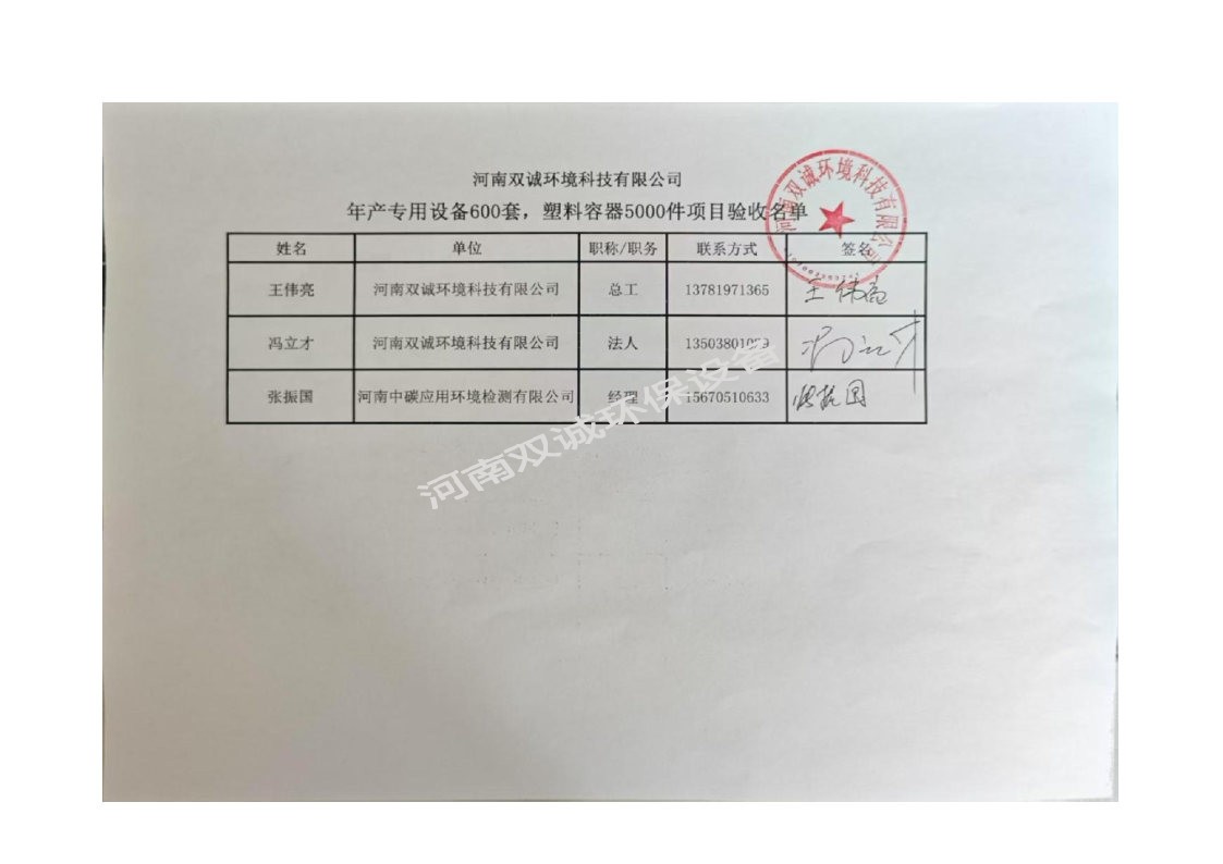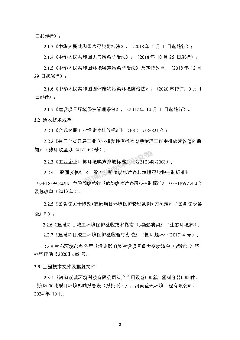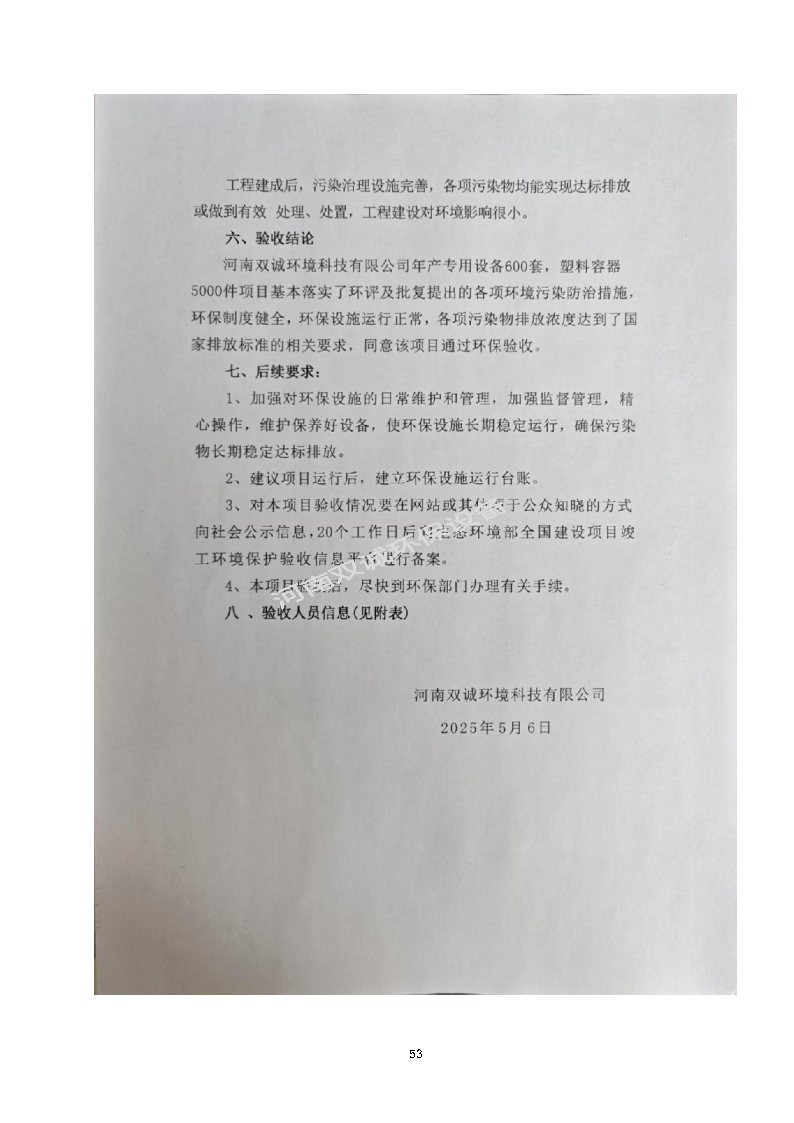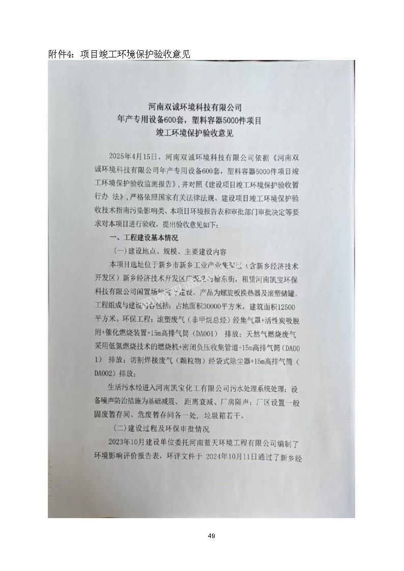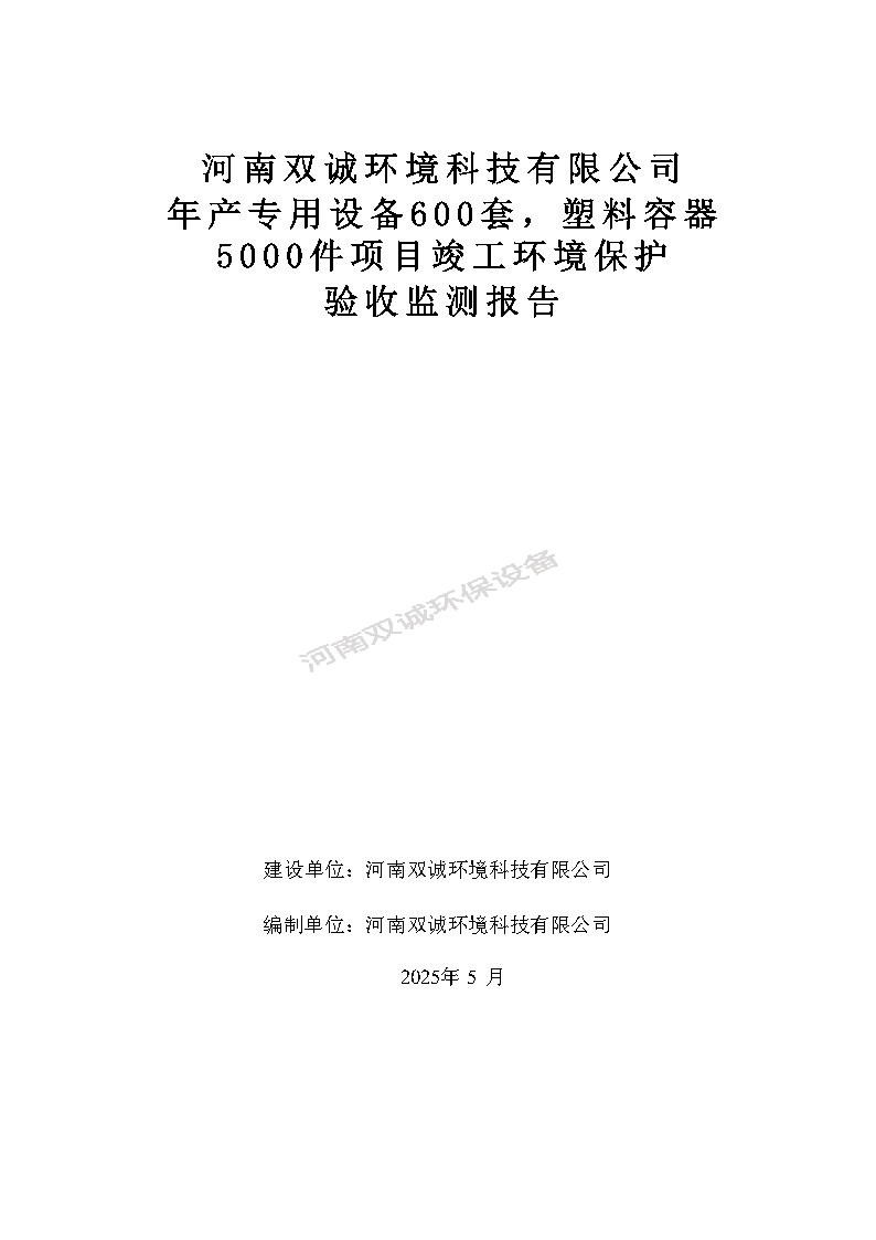 河南雙誠環境科技有限公司 年產專用設備600套,塑料容器5000件項目竣工環境保護 驗收監測報告
